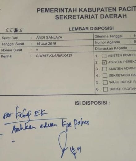 Penulis disposisi dan nama yang langsung tulis tangan pada lembar surat yang masuk.